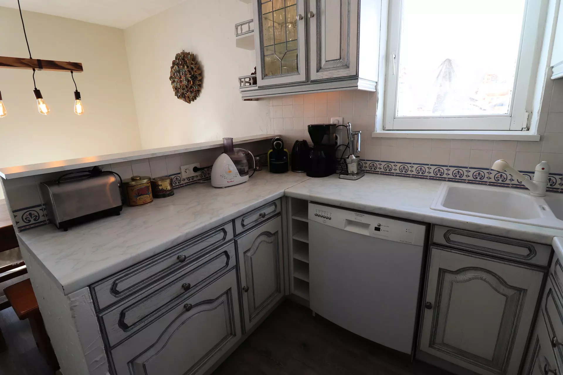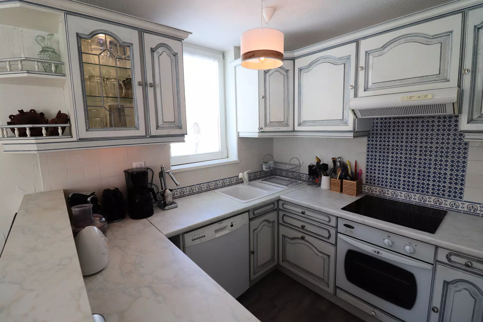 Cuisine avec plaques électriques, four, lave-vaisselle, micro-ondes et réfrigérateur combiné