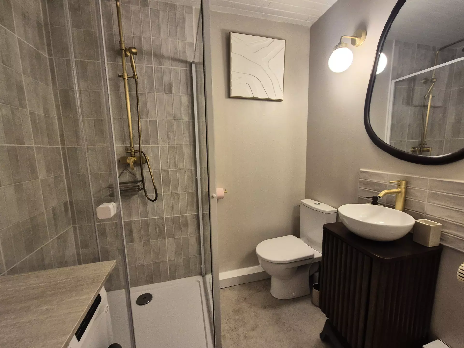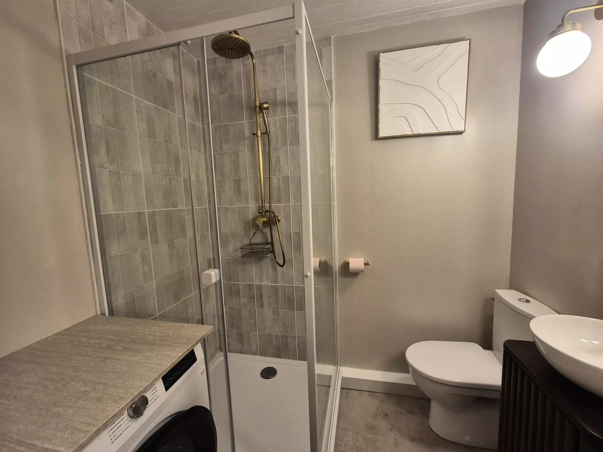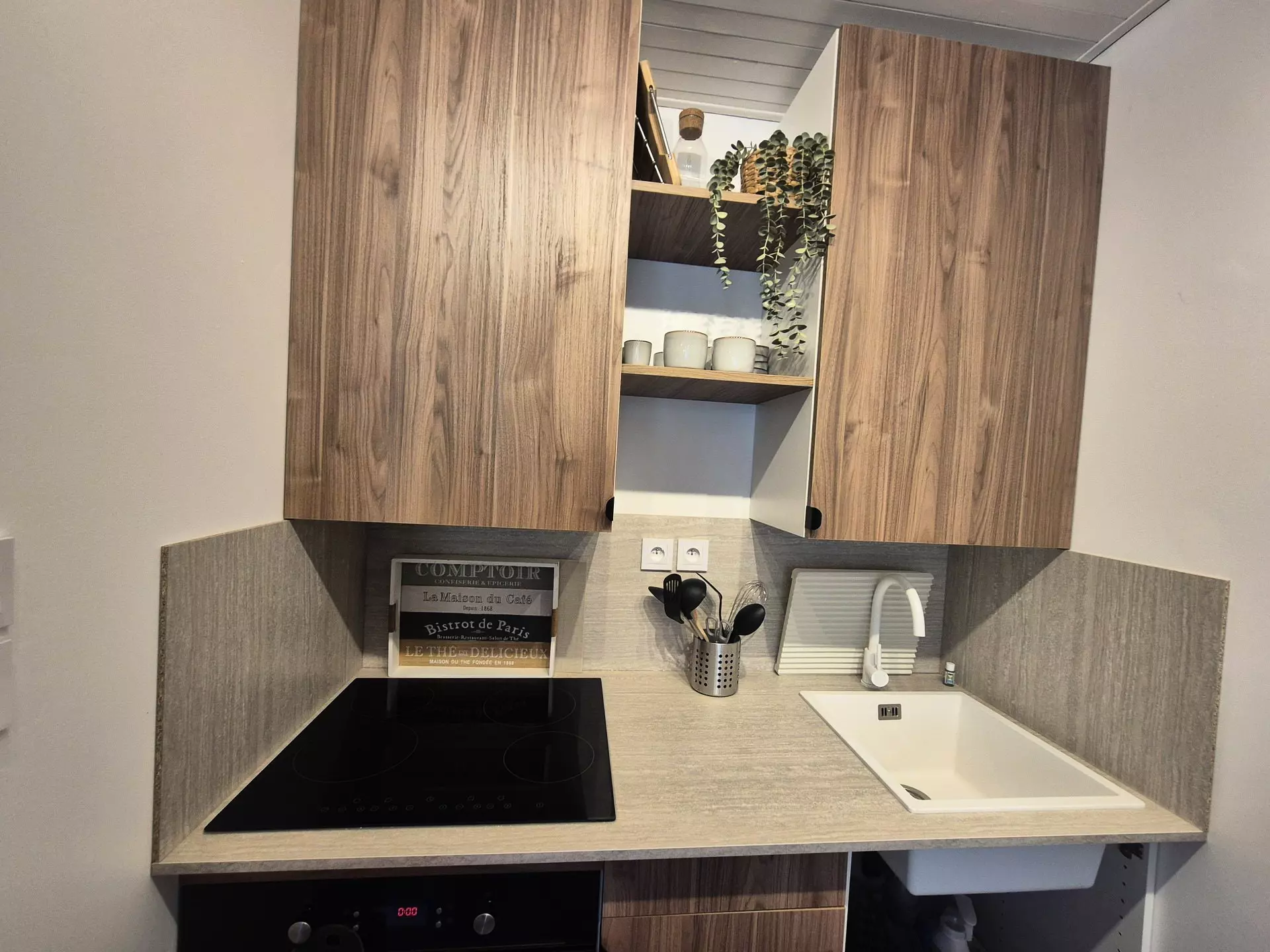 Cuisine équipée: micro-ondes, plaque de cuisson avec 4 feux , four, frigo